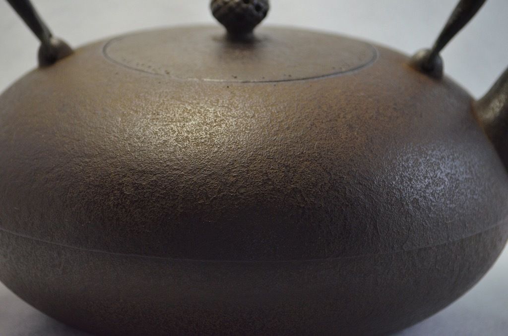 The skin is called "Kinu-hada (silk skin in Japanese)", there is no big pattern on it, so it is simple but it needs delicate skill to put those fine patterns. Because of its fine texture, it can not cover up any lines or marks with big patterns, so the fineness of this tetsubin's skin is one of a point that I would like you to focus on.