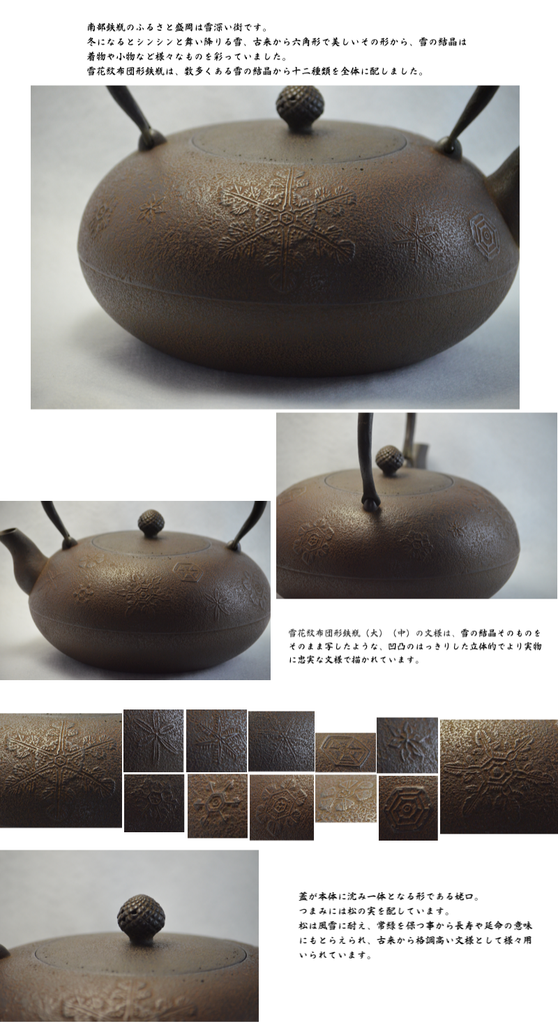 | 製品名 | 雪花紋布団形鉄瓶(大/L) | 雪花紋布団形鉄瓶(中/M) | 雪花紋布団形鉄瓶(小/S) |